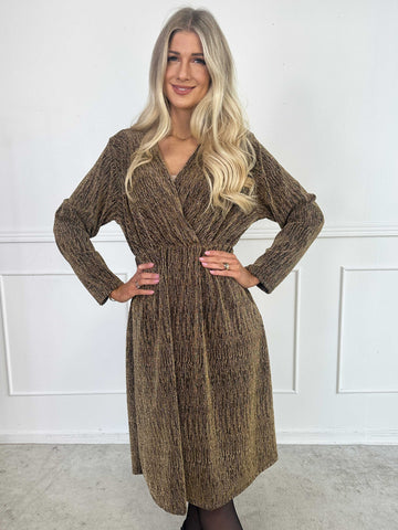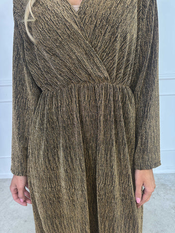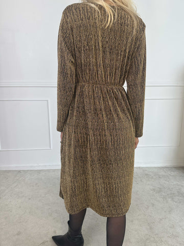 Ebba Gold Leaf Long - Elastisk enfärgad klänning med guld blommigt mönster