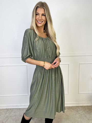 Ebba Forest Gold Long - Elastisk klänning med fint bladmönster och guldprickar
