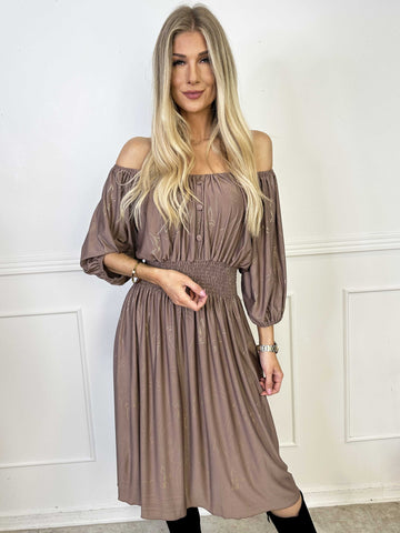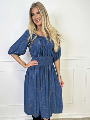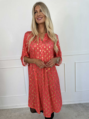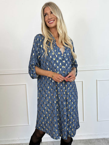 Cora Royal Gold Midi - Elastisk kjole med guld print