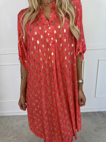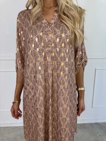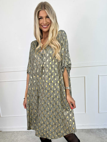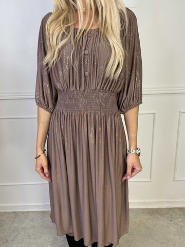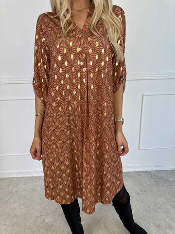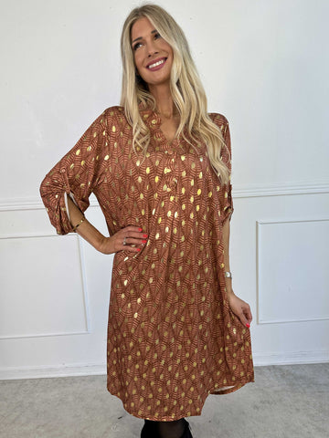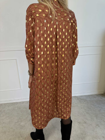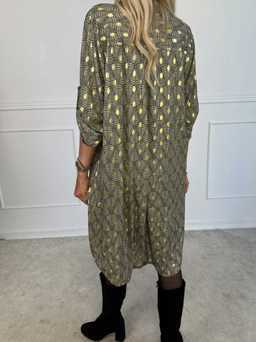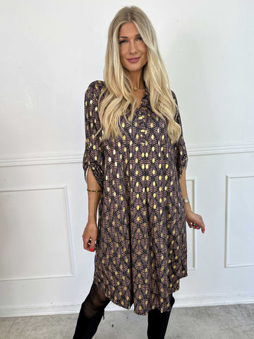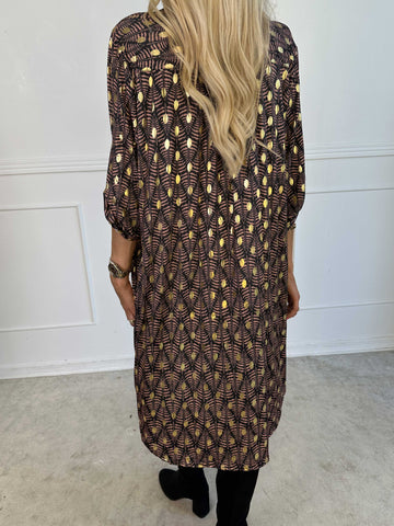 Elna Gold - Enfärgad plus size klänning med resår och guldmönster