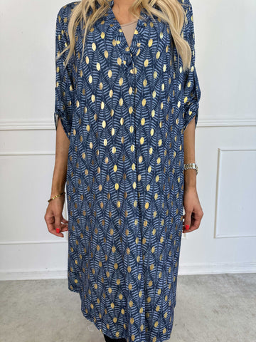 Ebba Gold Leaf Sleeveless - Plus size skjortklänning i stretchigt tyg med bladtryck