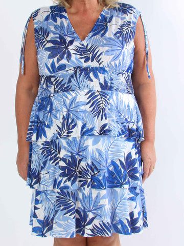 Pams Leaf Sleeveless - Elastisk klänning med bladmotiv och smockad midja