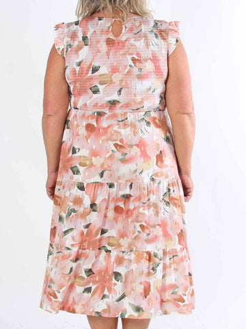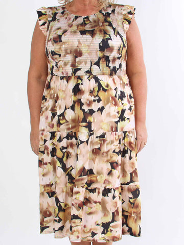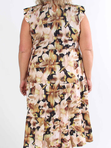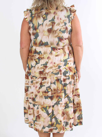 Kelly Floral Sleeveless - Blommig plus size-klänning med smockat bröst