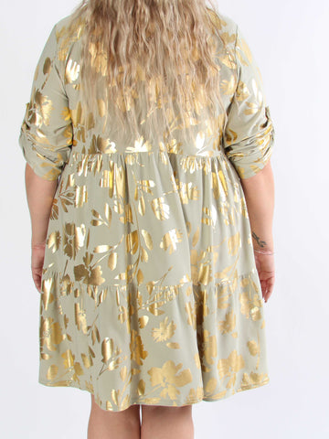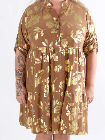 Milano Gold Flower Midi - Plus size-klänning med guldblad och lager-på-lager-look
