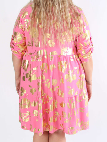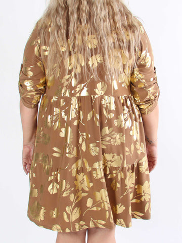 Mia Gold Flower - Skjortklänning i plusstorlek med resår och blommigt tryck