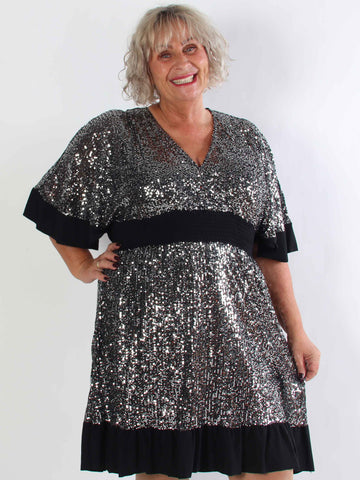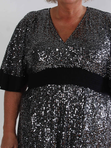 Pamela Glitter Short - Paljettklänning i plus size med volanger och smock