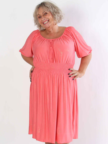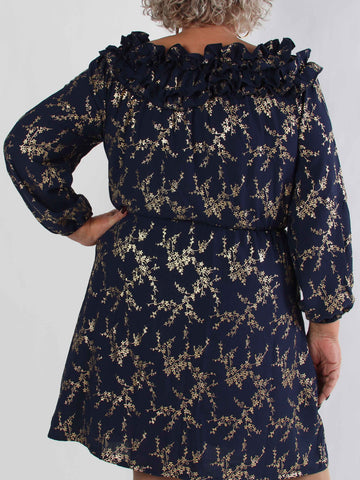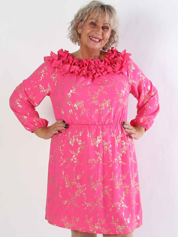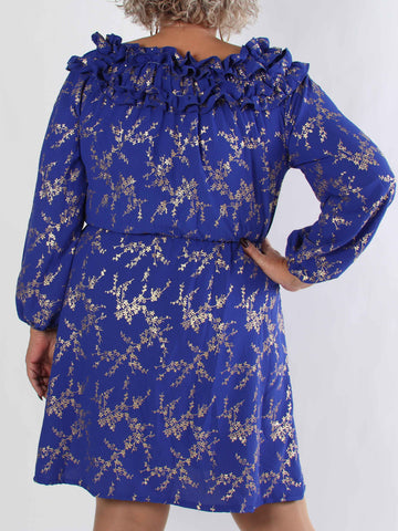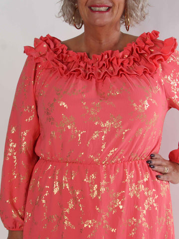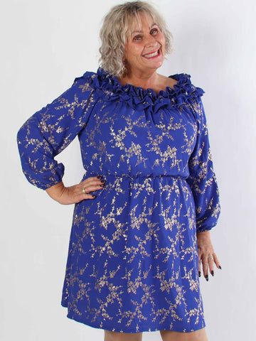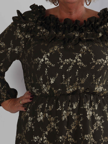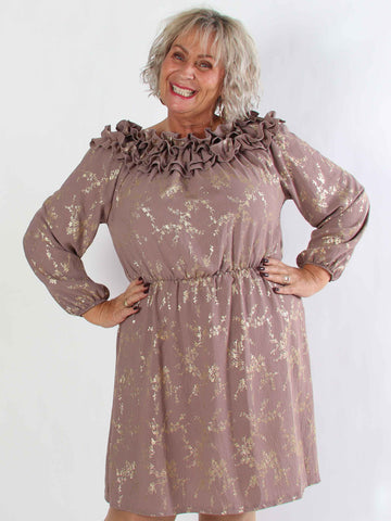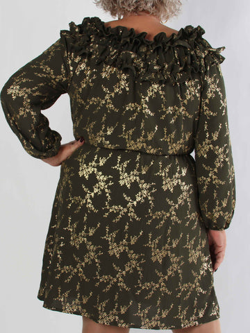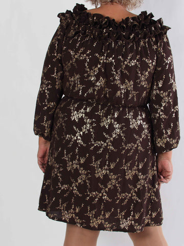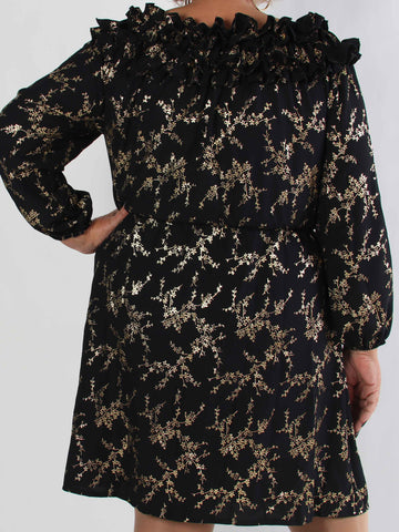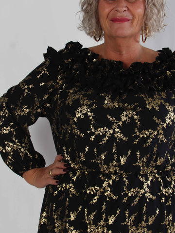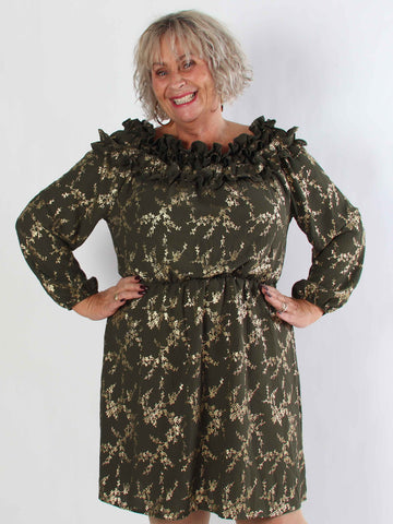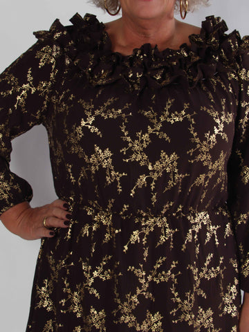 Chili Gold Fitted Dress - Plus size klänning i guldtryck med volangkant och resår i midjan