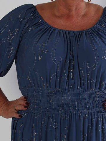 Cora Royal Gold Midi - Elastisk plus size kjole med guld print