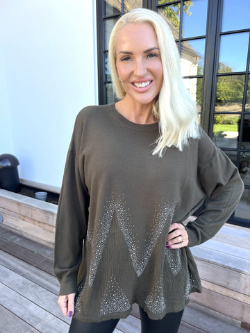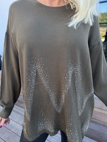 Ellrun - Mjuk tröja med sicksackmönster av strass nedtill