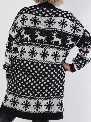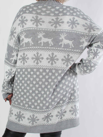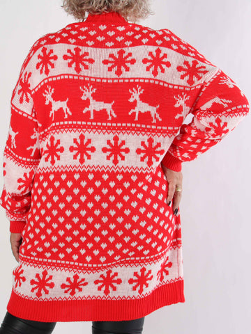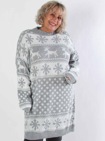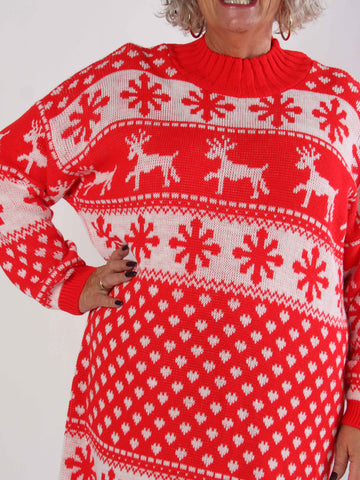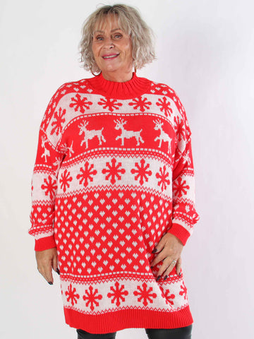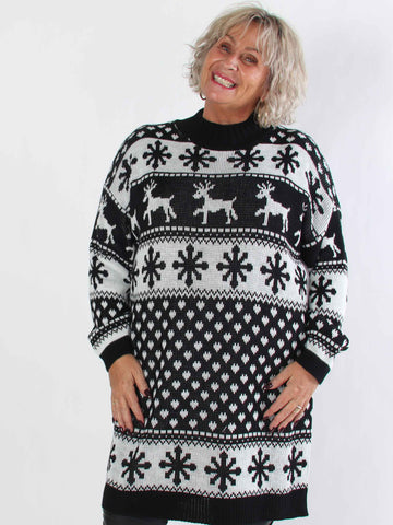 Elza - Stickad plus size julklänning med renar och snöflingor