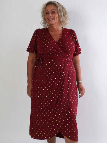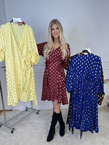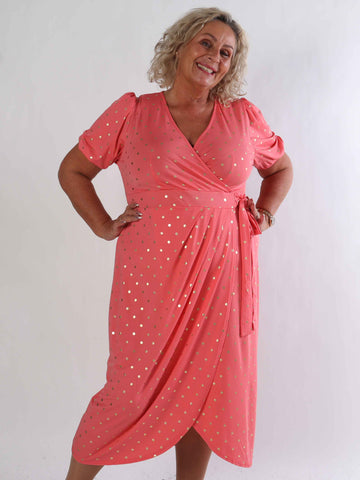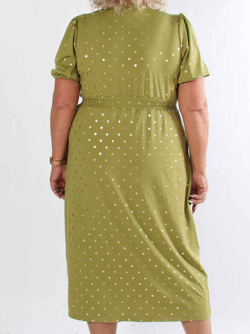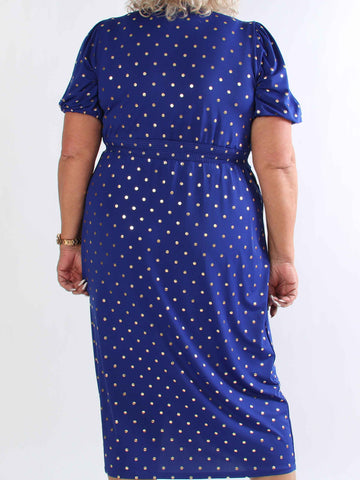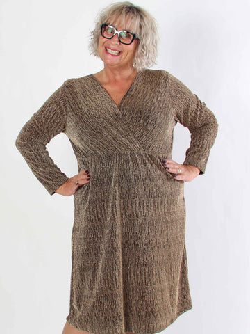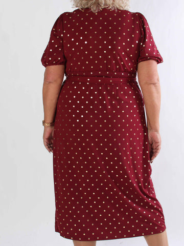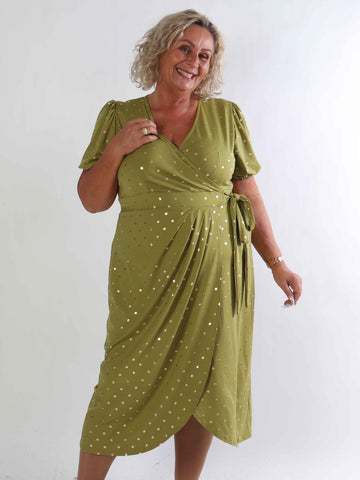 Savina Gold - Elastisk plus size kjole i slå-om-look med guld dutter