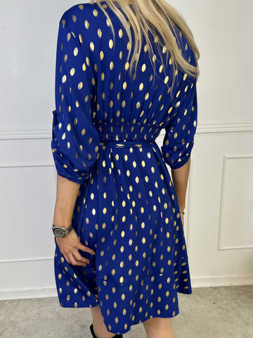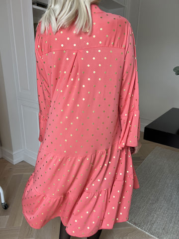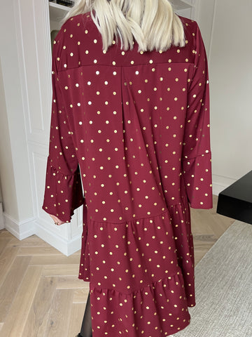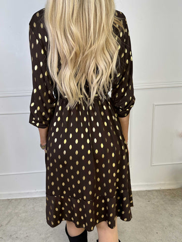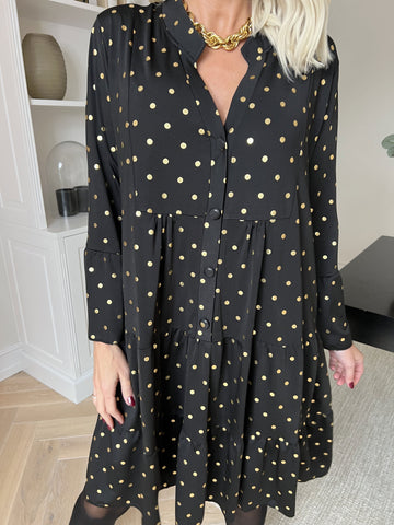 Milania Dot - Elastisk kjole med guld prikker og flæselag