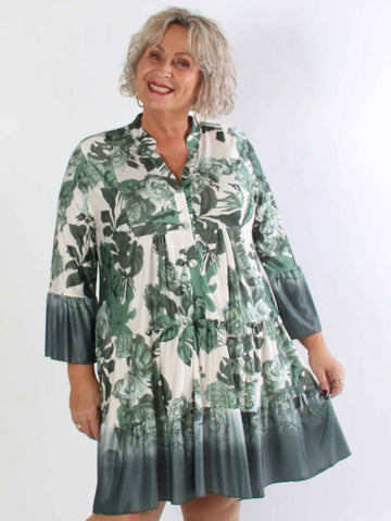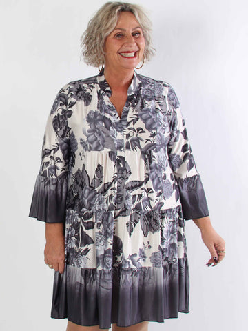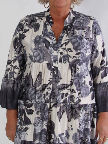 Milania Flower - Elastisk blomstret plus size kjole med flæselag