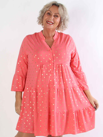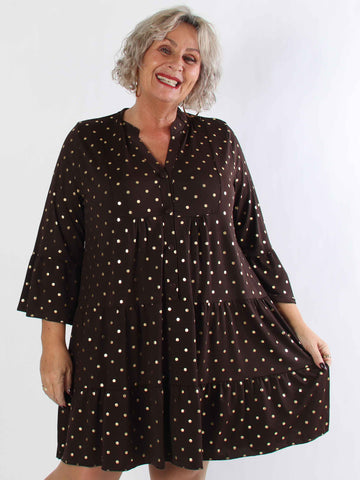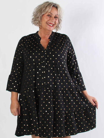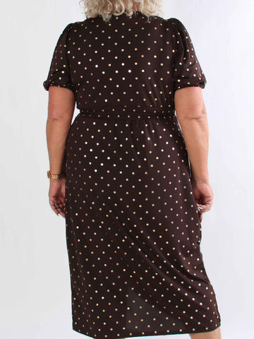 Milania Dot - Elastisk plus size kjole med guld prikker og flæselag