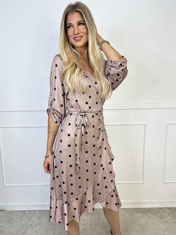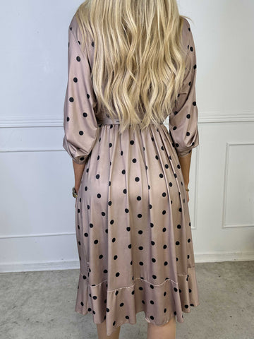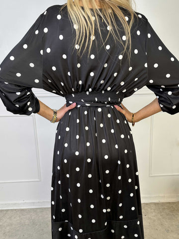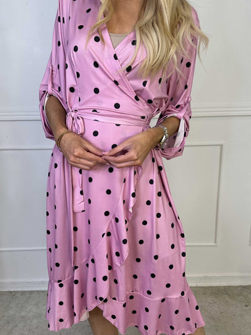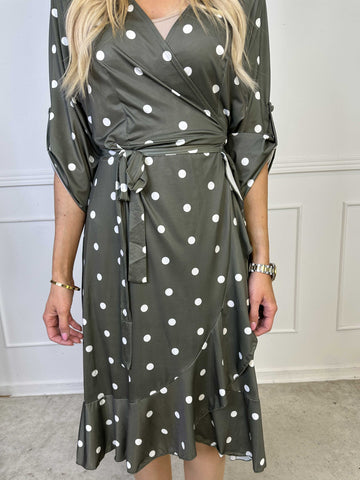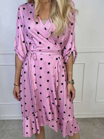 Savina Dot - Elastisk kjole i slå-om-look med prikker og flæsekant