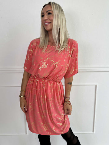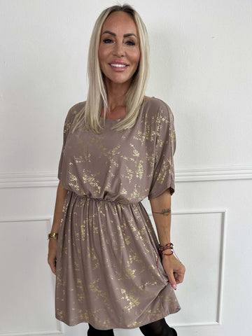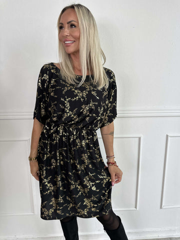 Venus Gold - Elastisk klänning mönstrad med guldfärgade blommor