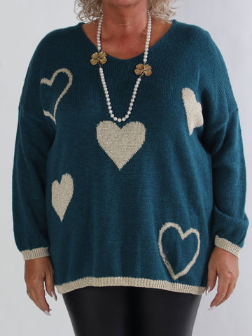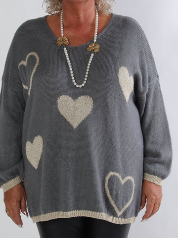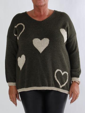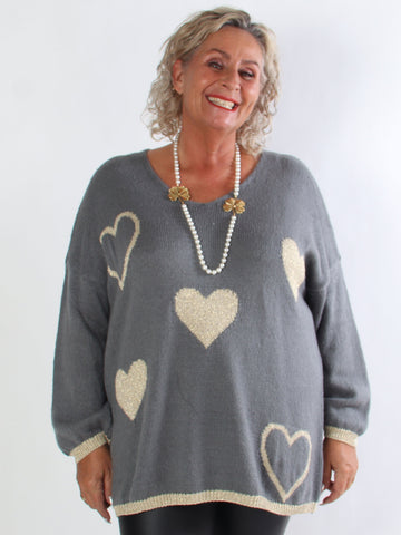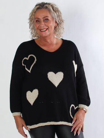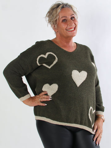 Lydia - Stickad plus size tröja med hjärtan i guldfärgad glittertråd