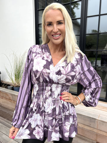Elna Water Lily Shirt L/S - Plus size blus med blommigt mönster och smock över bysten