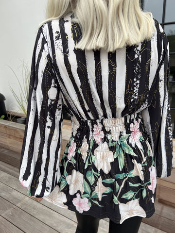 Pams Floral Stripe Shirt L/S - Elastisk blus med blommigt mönster och gulddetaljer