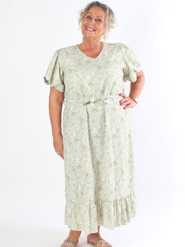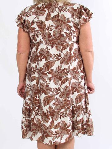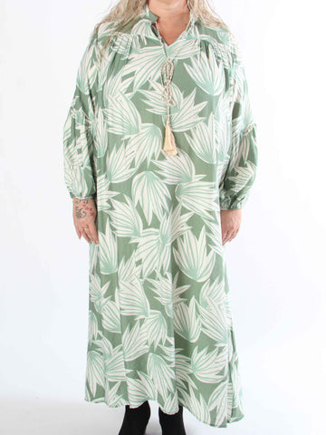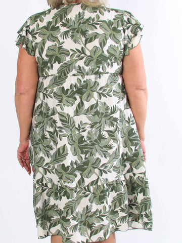 Palma - Elastisk klänning i plus size med blad och volangärmar