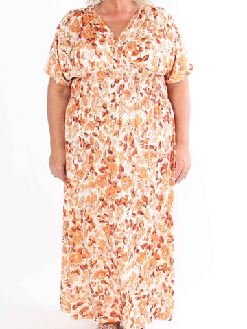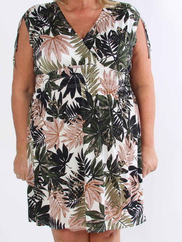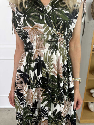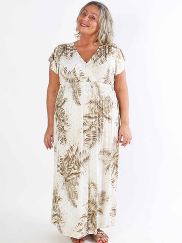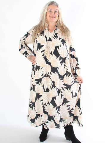 Pams Leaves - Elastisk klänning i plus size med bladmotiv och smockad midja