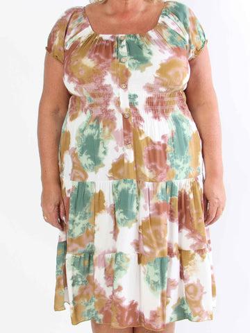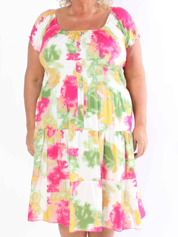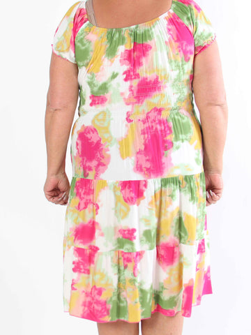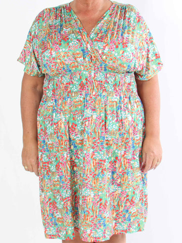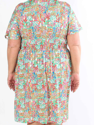 Leah - Mångfärgad plus size-klänning i viskos med puffärmar och fickor