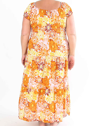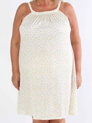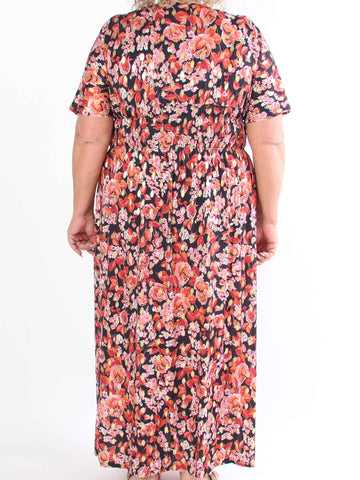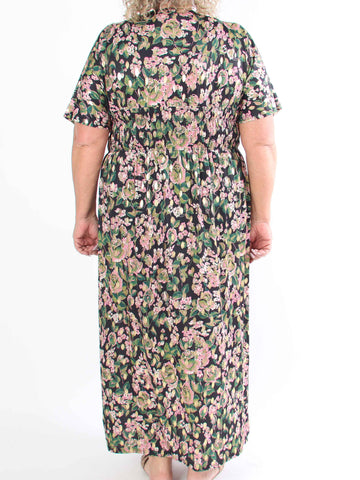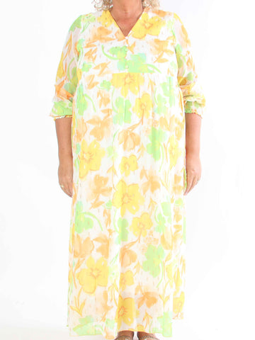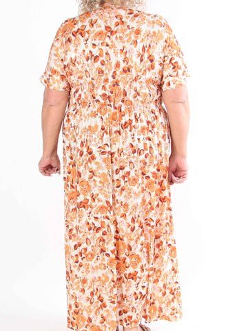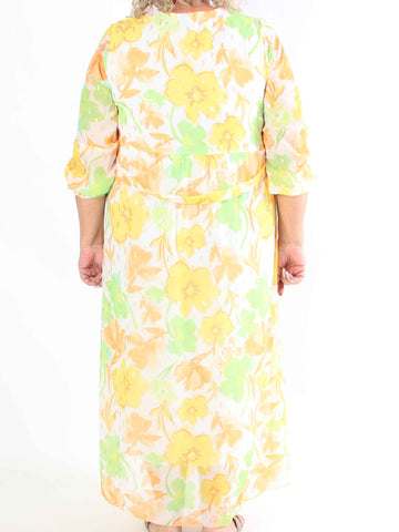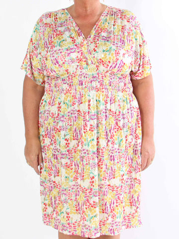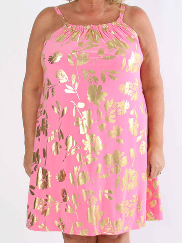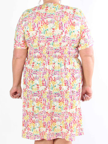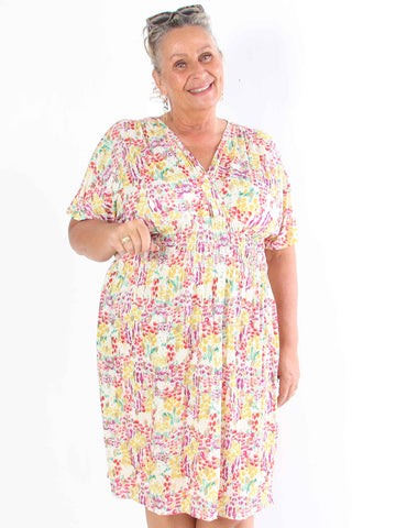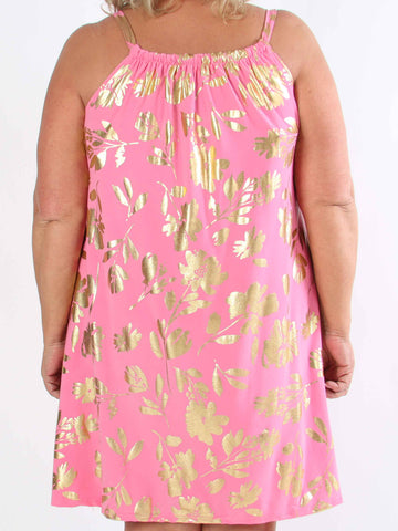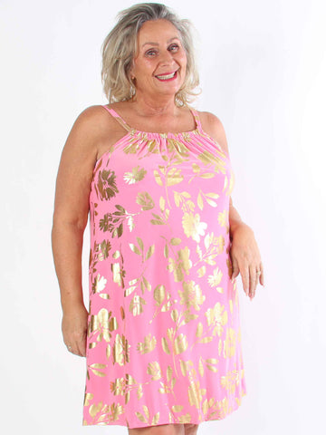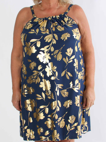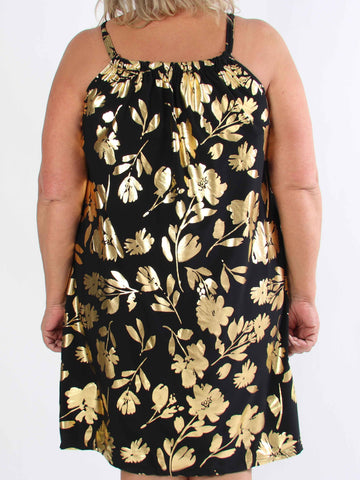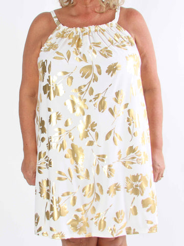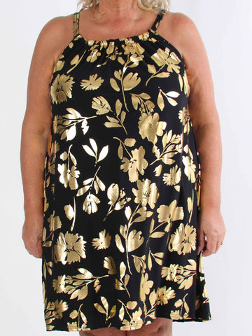 Pams Multi Flower Short - Klänning i plus size med blommönster och gulddetaljer
