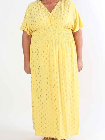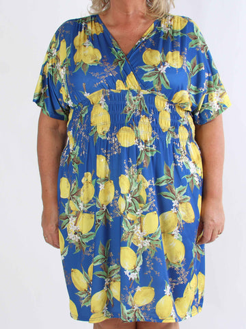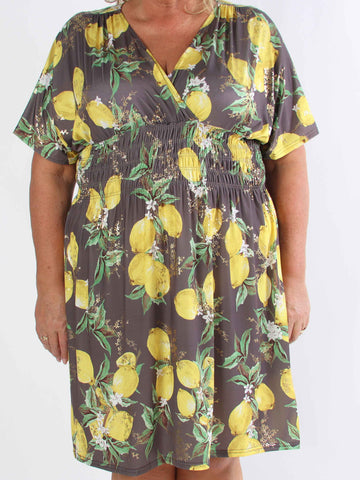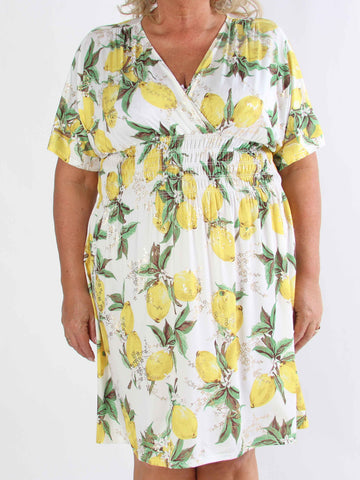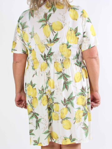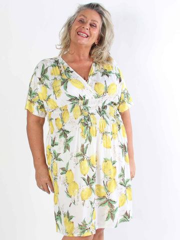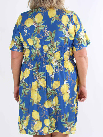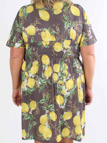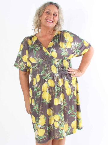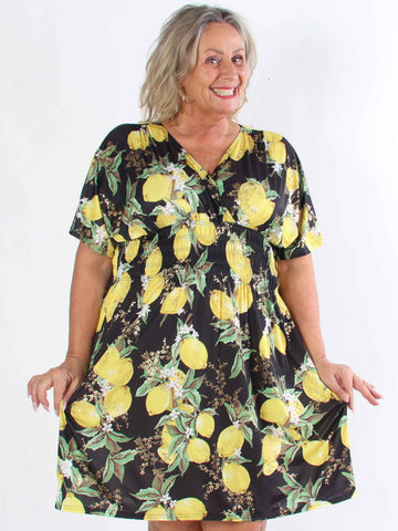Pams Lemon Short - Plus size-klänning med citroner och gulddetaljer