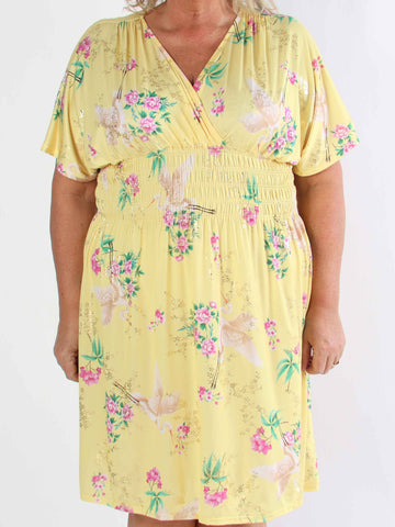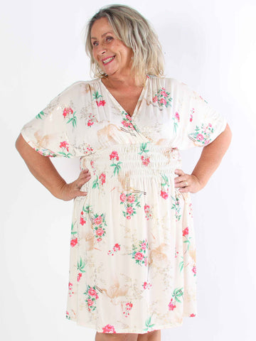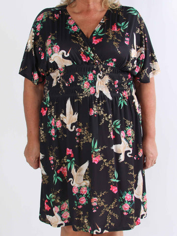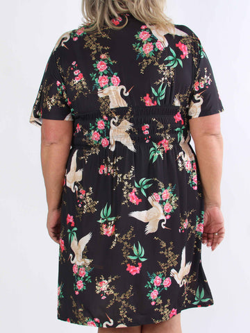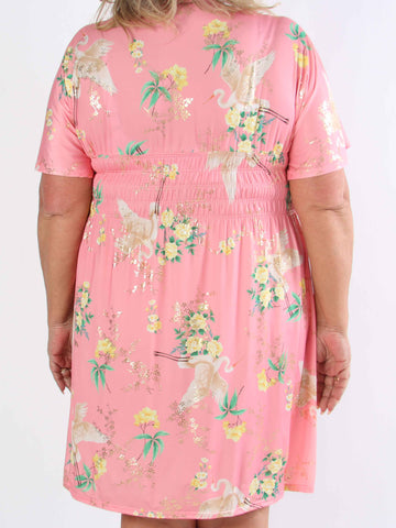 Pams Fly Short - Elastisk plus size-klänning med blommor och fåglar
