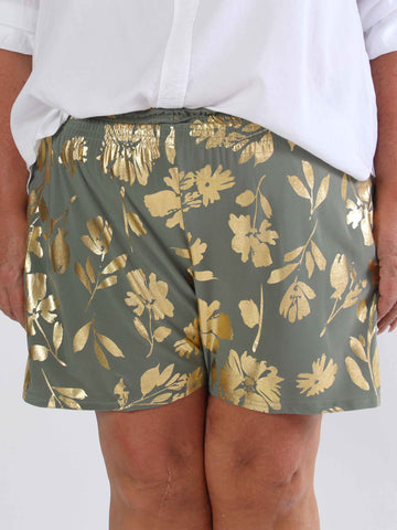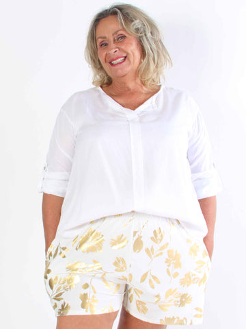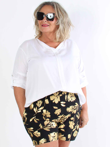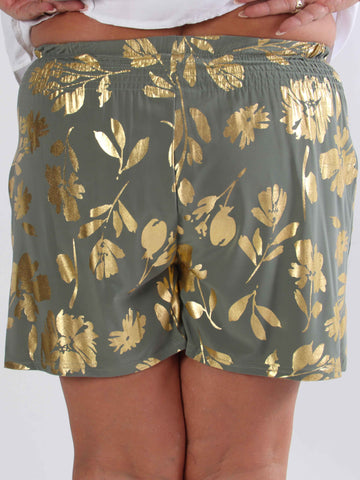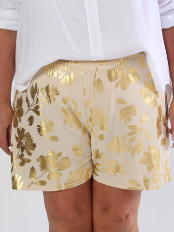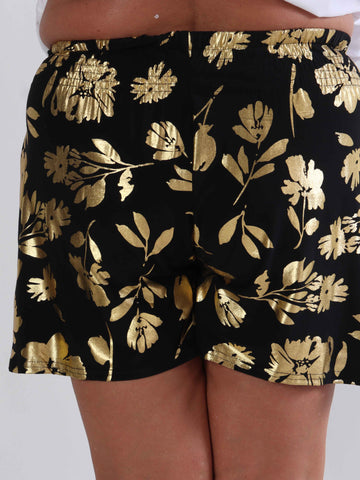 Pams Gold Flower Shorts - Elastiska shorts i plusstorlek med guldblad