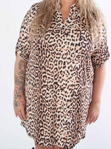 Penelope - Elastisk plus size-klänning i leopardmönster med gulddetaljer