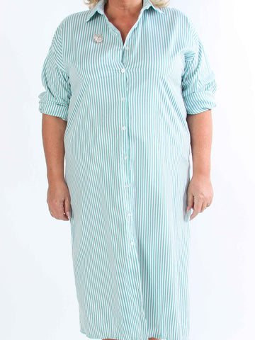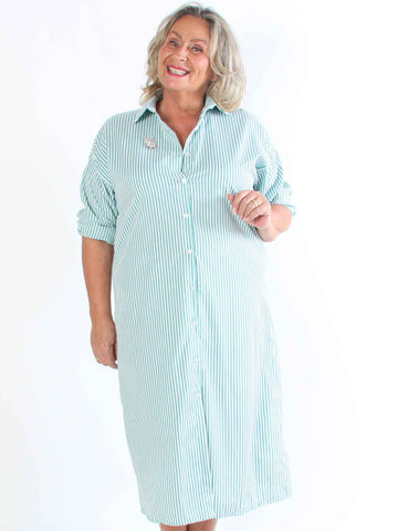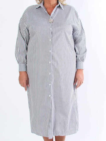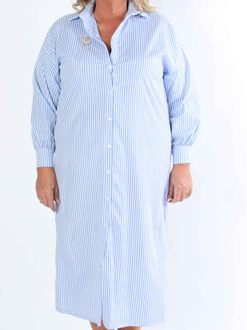 Raizal - Plus size randig skjortklänning i viskos med brosch