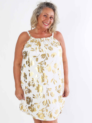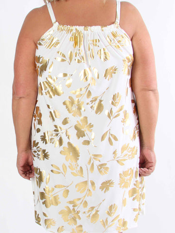SunLove Gold Flower - Elastisk bandklänning i plusstorlek med stora guldblad